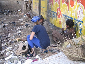 Rencontre, distribution d'un peu de nourriture aux abords de