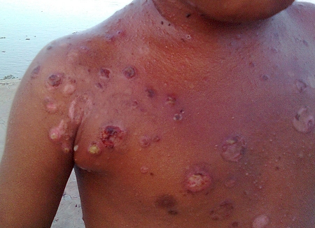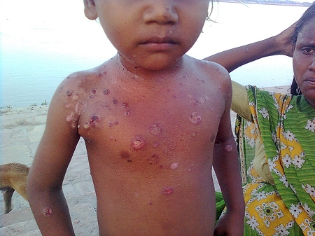 enfant de 8 ans environ, couvert de plaies virales sur le