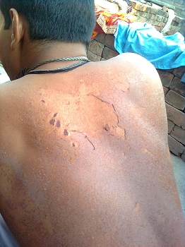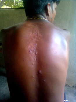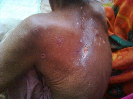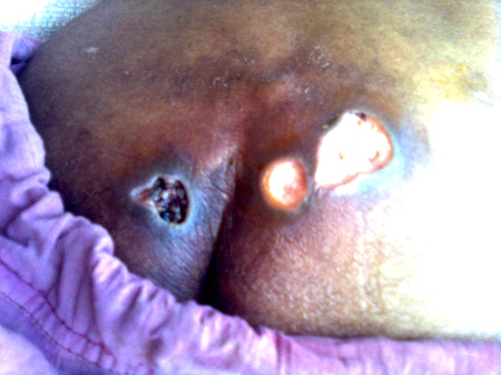 Le furoncle ! La "plaie" (au sens propre et figuré !) des indiens. Ils se propagent en masse dans la population selon la période de l'année. L'arrivée de la mousson, chaude et humide est leur terrain favori. Au début, un petit bouton inoffensif qui démange. Puis il grossit devenant de plus en plus douloureux, mais à l'intérieur. Pouvant devenir énorme (d'un petit centimètre à 5 ou 6 cm de diamètre), il gonfle de l'intérieur, plein de pu sous pression. Quasiment aucune solution si ce n'est d'attendre qu'il mûrisse. Certains préfèrent les ouvrir au scalpel. Sinon, il finit par percer et il faur sortir le pu par pression, ce qui est horriblement douloureux. Puis des pansements quotidiens sont nécessaires pour éviter l'infection sur une plaie ouverte qui mettra parfois longtemps à se fermer, puis à cicatriser selon l'importance. Ici, 3 furoncles sur les fesses d'un enfant. Le frottement des vêtements n'a pas aidé à la cicatrisation.