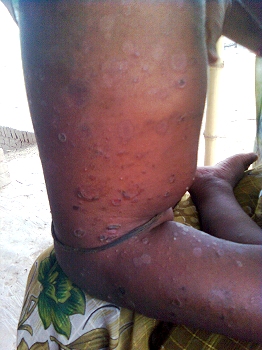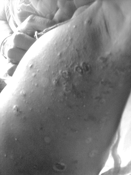 Enfant atteint d'une infection généralisée, probablement un staphylocoque. On le voit ici de profil, sous le bras. Un traitement antibiotique est obligatoire ici. Seul le médecin aura le pouvoir de le lui prescrire. Nous faisons dans le cadre de l'association le nettoyage antiseptique quotidien des plaies infectées et l'achat des médicaments au besoin (en général gratuits au dispensaire sauf pour des traitements particuliers).