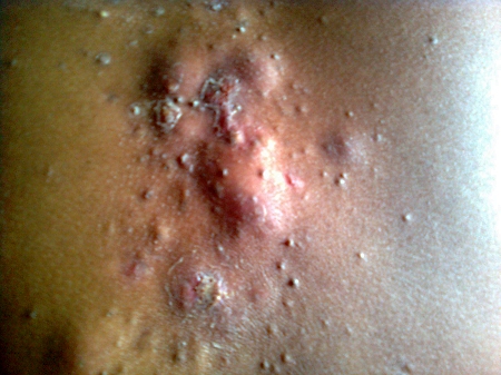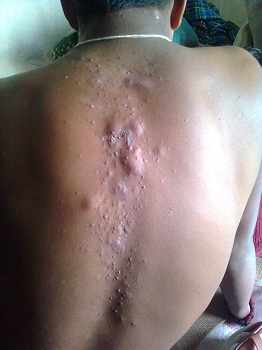 Vue générale du dos du même jeune. Quelques mois plus tard, l'infection se développe. Des zones grossissent et sont très douloureuses, du pus en sort au bout de quelques jours. Comme des furoncles.