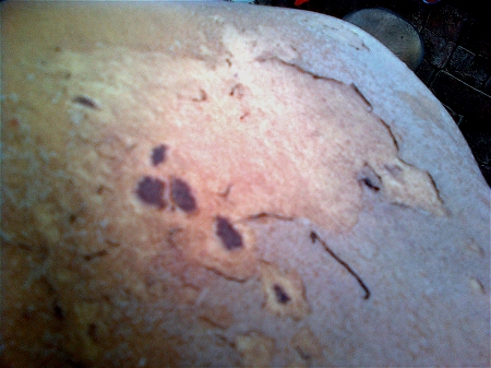 Gros plan sur la zone qui a réagit au passage de la scolopandre. La peau se renouvelle naturellement (application de biafine pour aider au bon renouvellement).