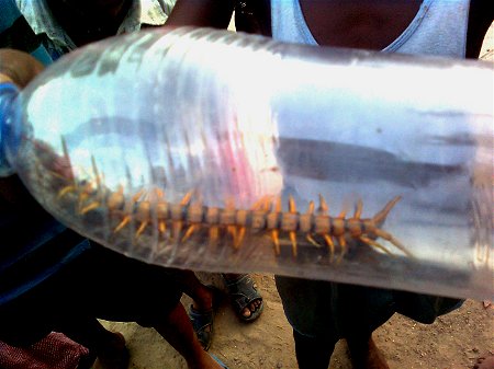Voilà la bête ! Les enfants l'ont attrapée dans une maison et vont la jeter au Gange (on ne tue pas les animaux gratuitement !). Environ 15 à 20cm de long, elle pique. La scolopandre peut être de petite taille aussi, noire comme un mille pattes, plus courante que ce modèle là mais aussi dangereuse.