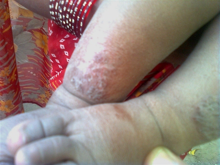 Enfant de 8 mois (la photo n'est pas très bonne !). Des zones noires ou épaisses se forment au niveau du bas des jambes. En général, c'est très irritant. La zone en principe s'étale petit à petit. Les démangeaisons sont surtout la nuit. A force de gratter, il se forme des plaies qui s'infectent.
