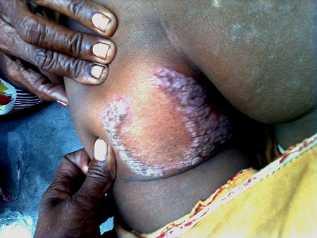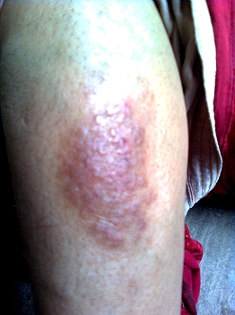 Femme d'une 50e d'années. Zone à champignons qui démange, au niveau du haut de la jambe. Contrairement à l'habitude où cela devient noir et comme de la peau d'éléphant, ici la zone épaisse reste plus ou moins rouge. Au bout d'un an, la zone est toujours là, s'étant plus ou moins développée en épaisseur et rougeur en fonction des crêmes.