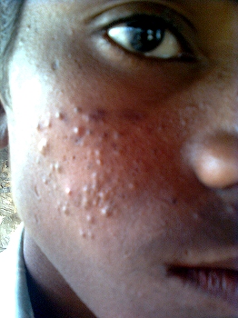Soins effectués : crèmes assez peu efficaces. Beaucoup d'indiens gardent des cicatrices au visage, soit au moment de la varicelle, soit à cause de l'acné mal gérée.